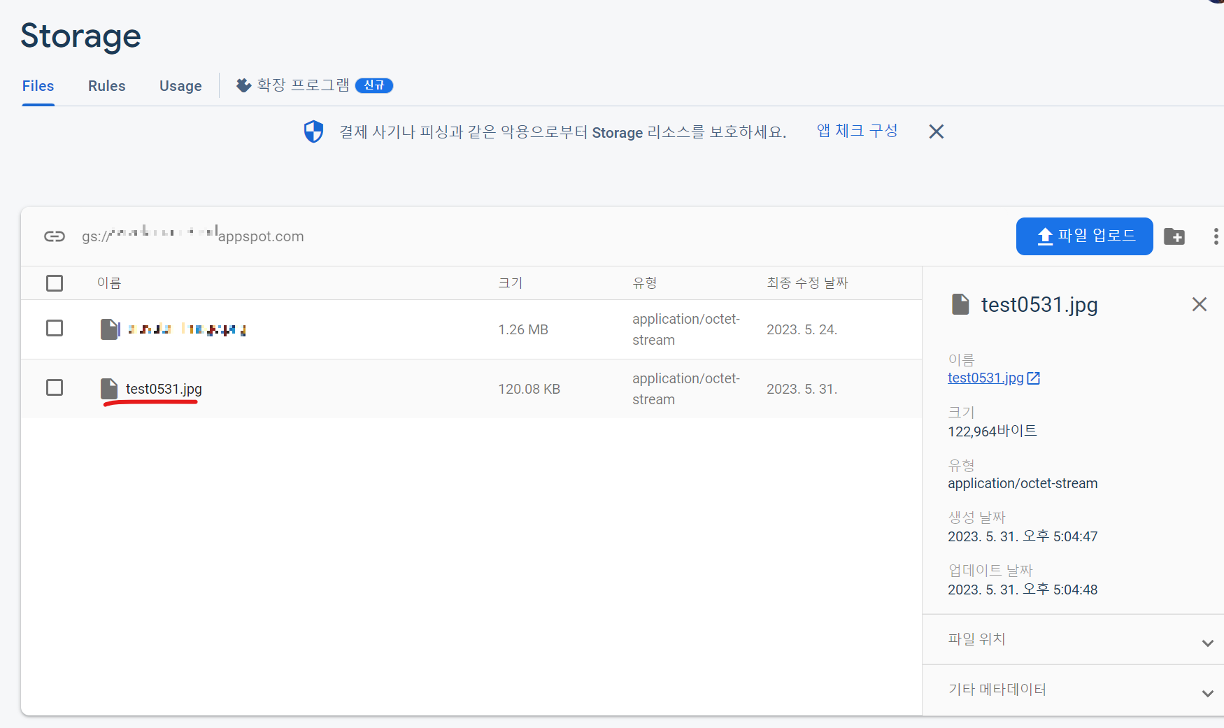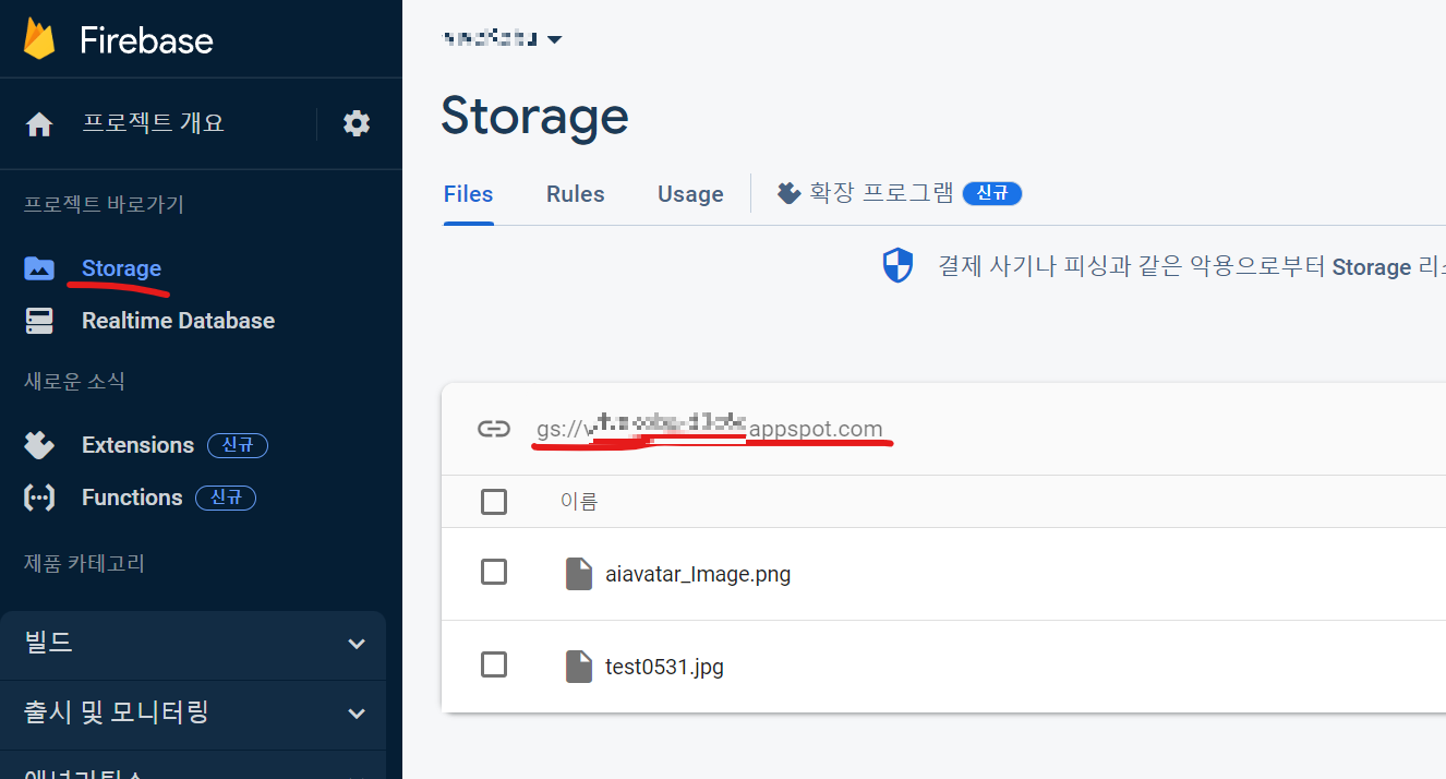 firebase에서 storage > files에서 gs://~~로 되어있는 주소 정보를 복사합니다.