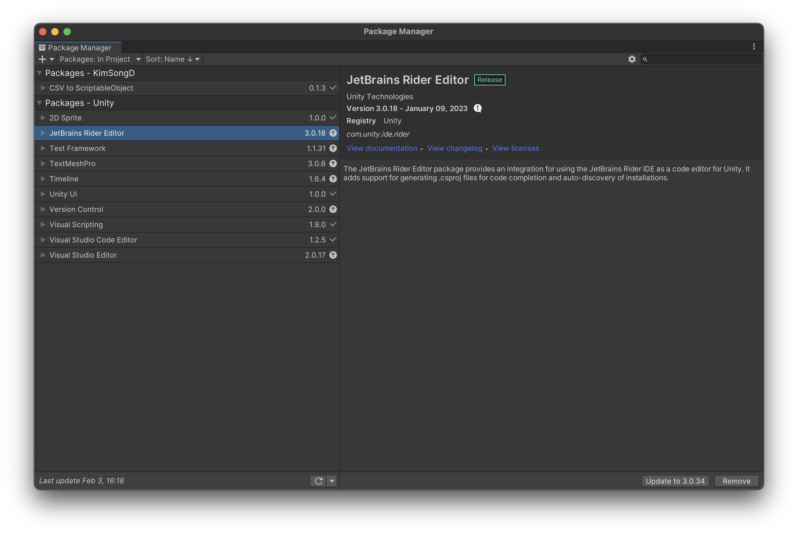 Packages: Unity Registry로 변경 후 JetBrains Rider Editor를 검색해서 설치한다.