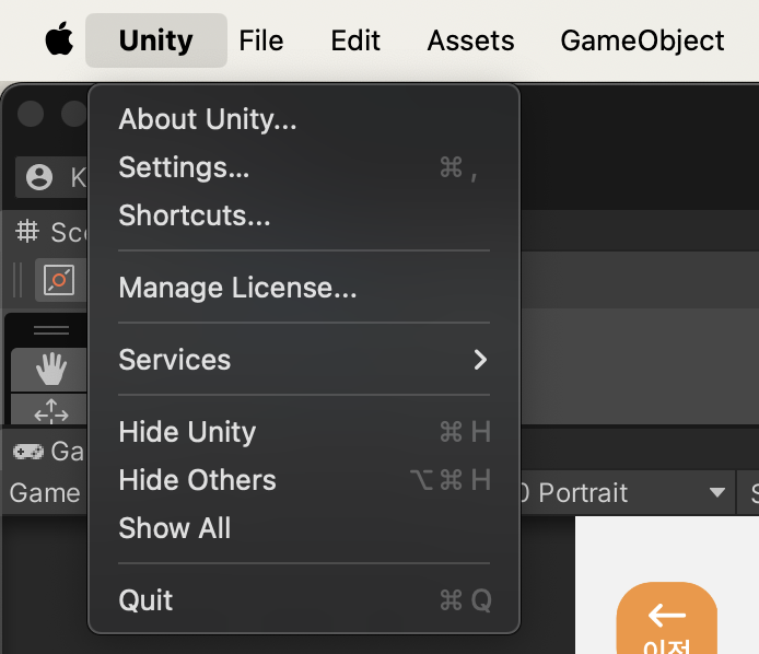다시 상단 바에서 Unity > Settings를 클릭한다