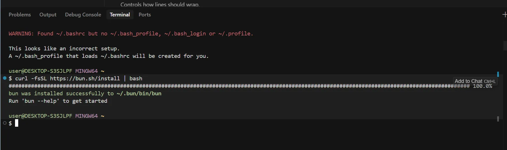 terminal에서 curl -fsSL <https://bun.sh/install> | bash