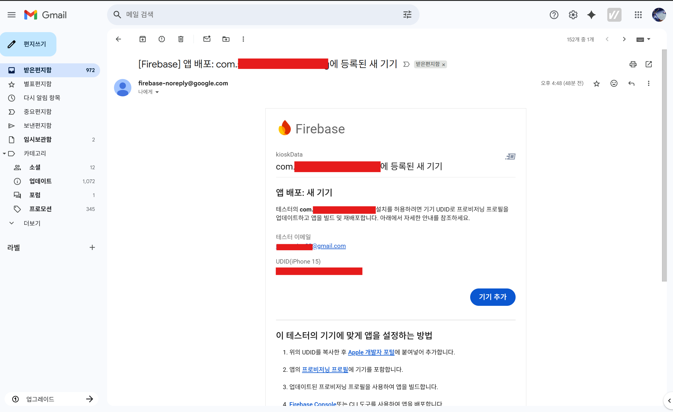 위 같은 메세지를 받았으면 해당 테스터의 UDID정보가 개발자의 메일로 전송이 된 상태다.