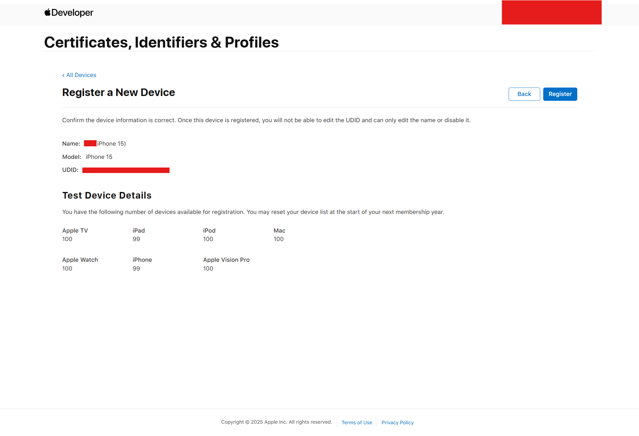 Device Name은 테스터 정보를 쓰고 Device ID에 메일로 받은 UDID를 입력해준다