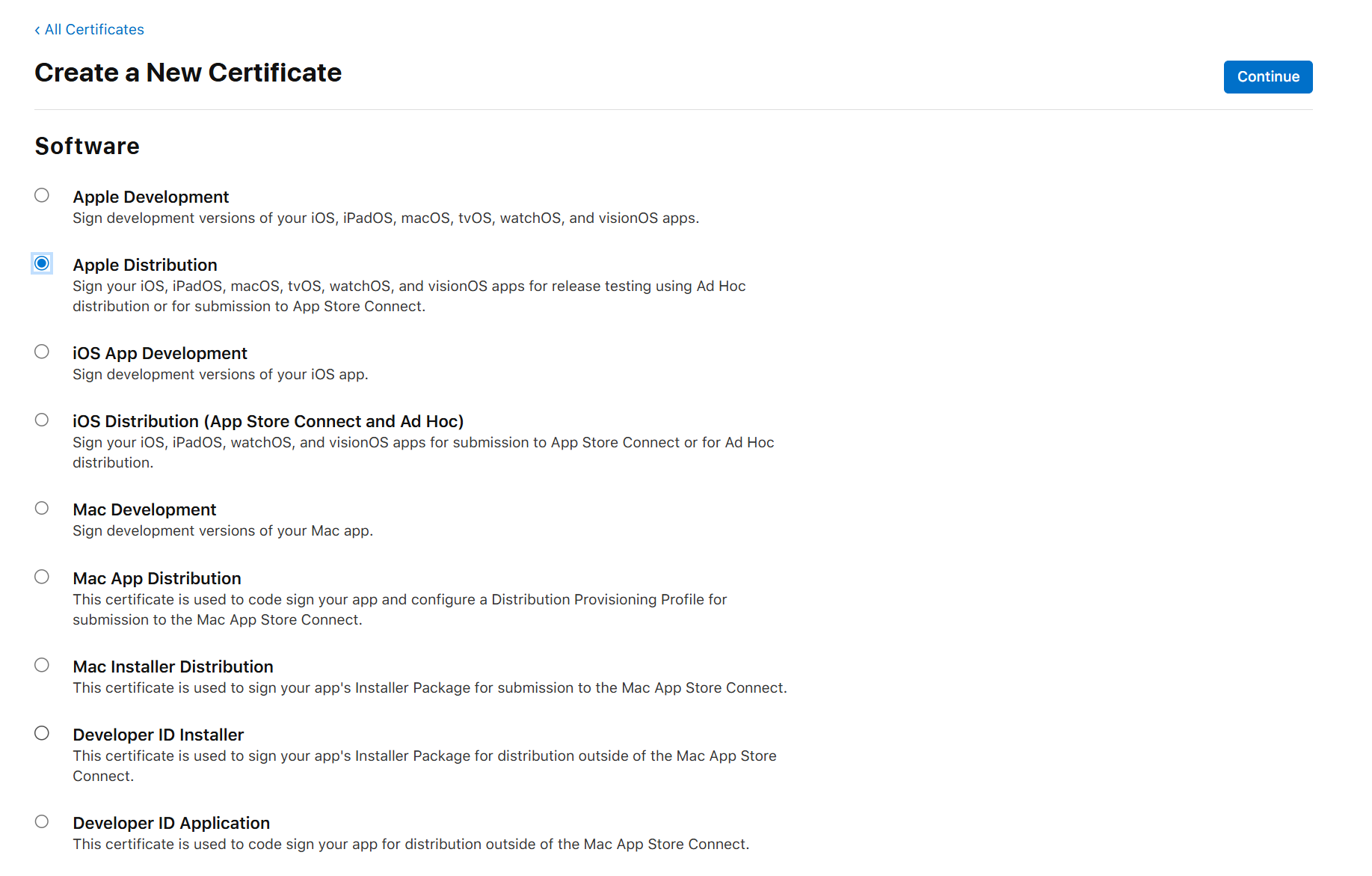저는 내부 배포용이기 때문에 Apple Distribution으로 체크했습니다.