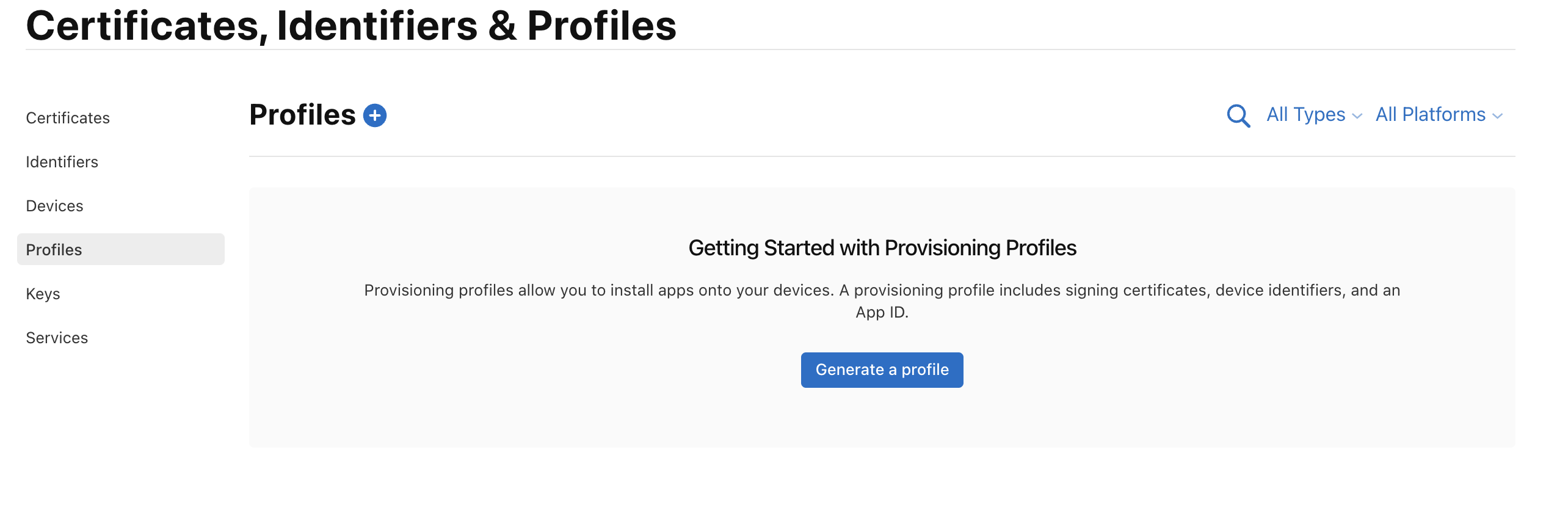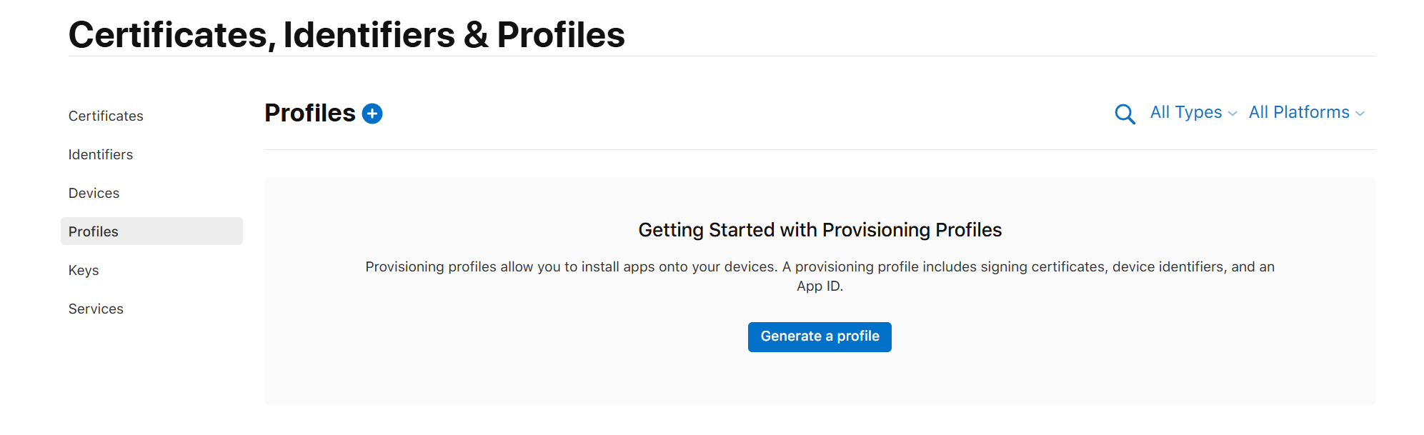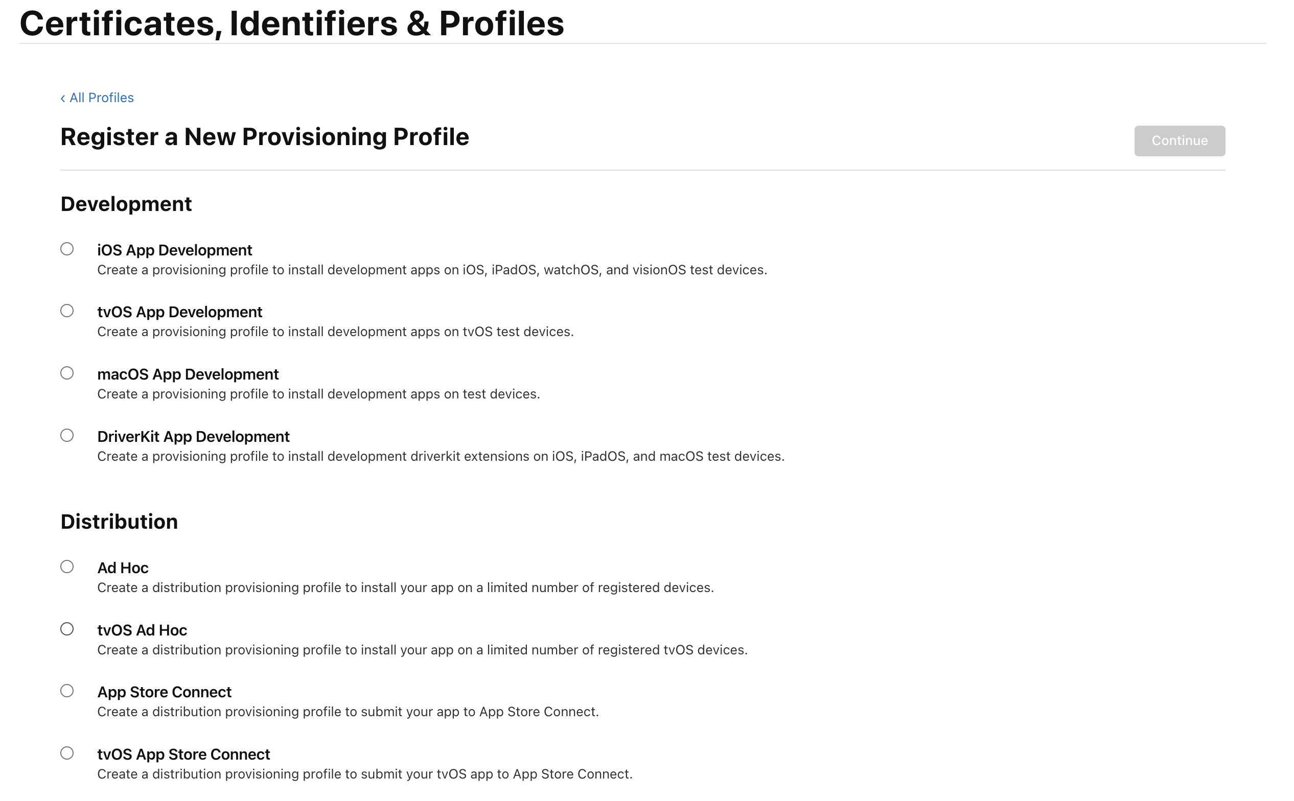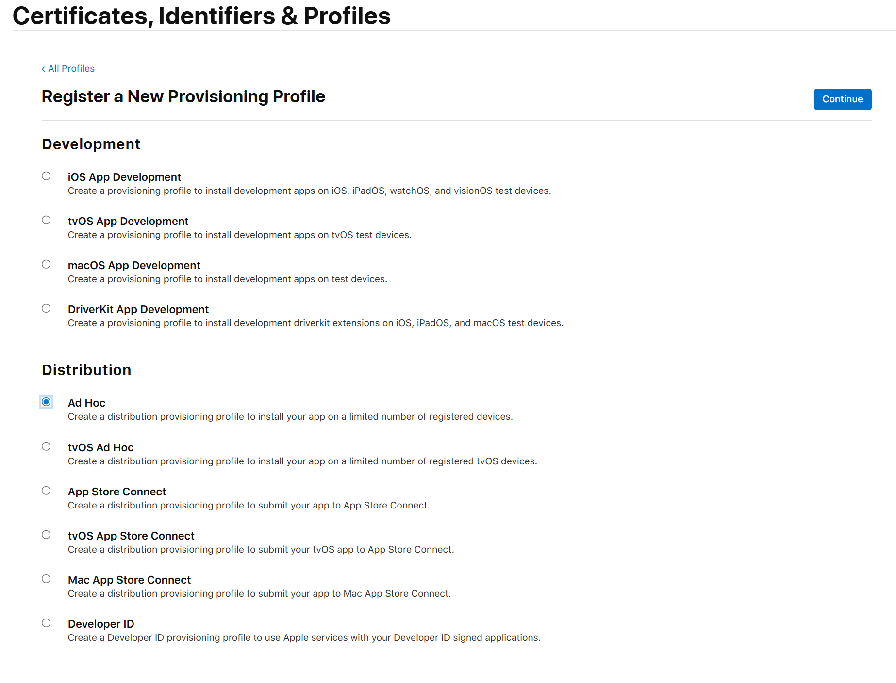 apple developer console에서 좌측 탭에 Profiles항목으로 이동한다.