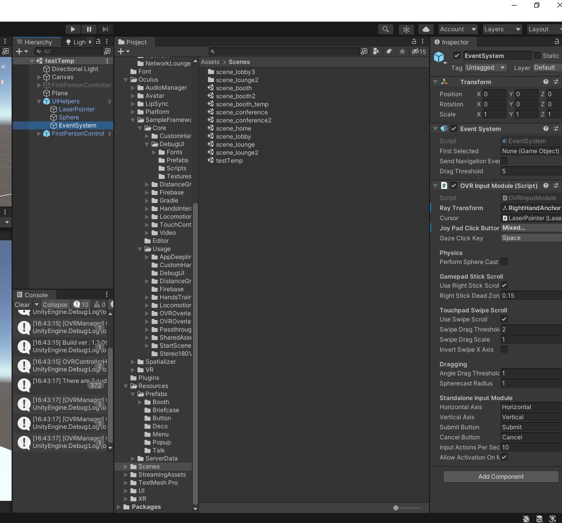 해당 씬에서 사용하고있는 프리팹중 uihelpers를 살펴보면 이벤트 시스템에서 인풋 모듈이 standard가 아니라 ovr input module임을 확인할수 있다
