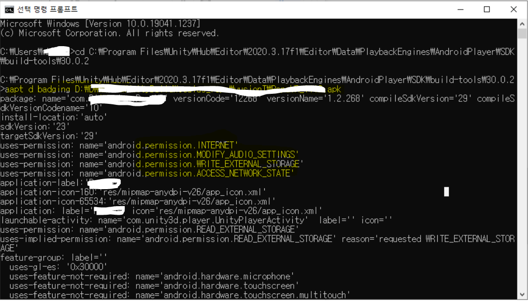 2. aapt d badging apk파일위치및이름 입력하기