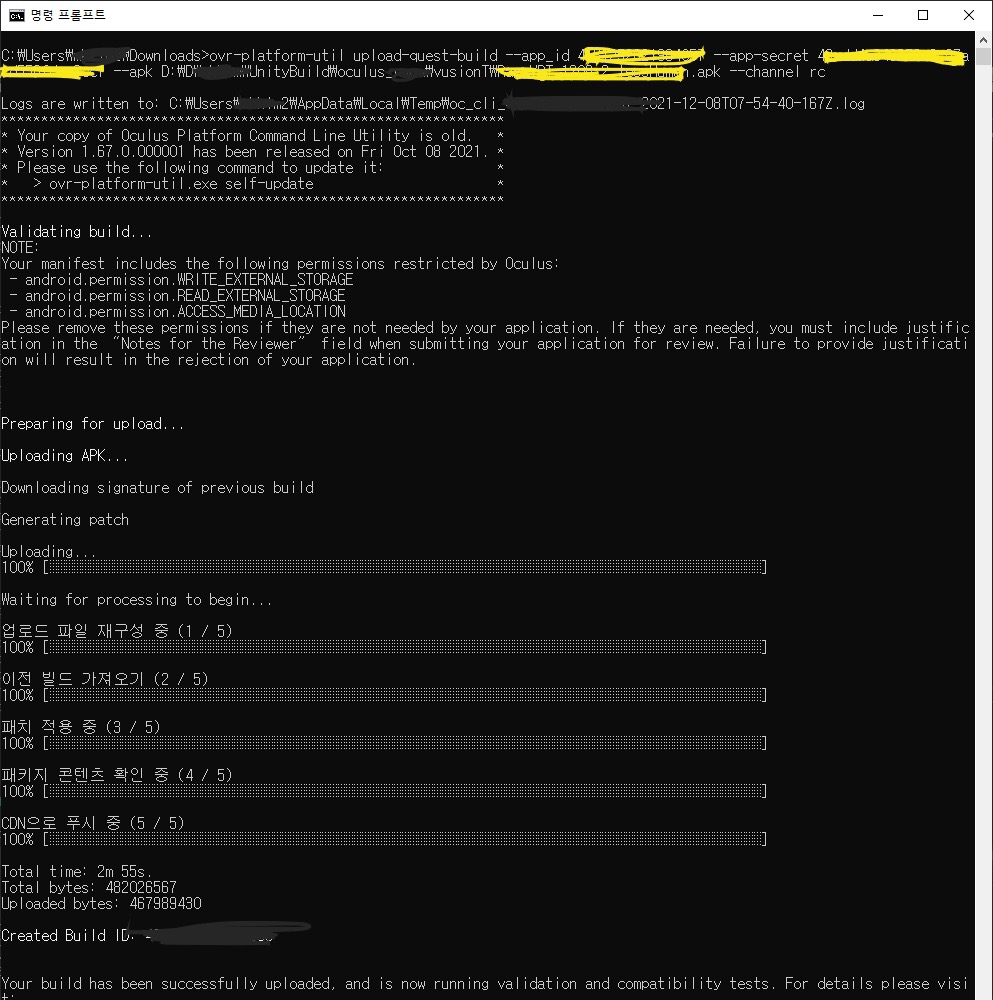 ovr-platform-util upload-quest-build --app_id 앱아이디 --app_secret 앱시크릿 --apk 로컬주소/파일명.apk --channel rc