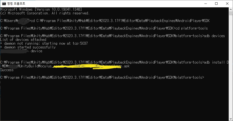 그후 adb install 빌드파일위치및파일명 을 입력하면 설치할수있다.