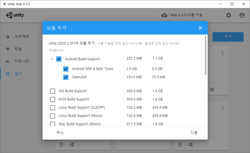unity hub에서 사용할 버전의 모듈을 추가해야합니다
